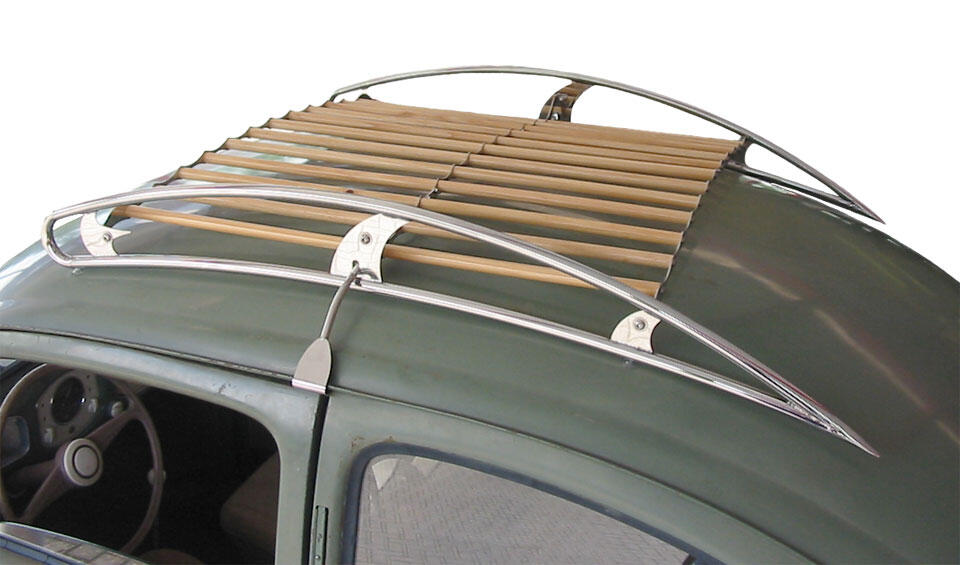 Do sportowego modelu Karmann-Ghia możesz zamontować bagażnik marki BBT. Producent zadbał o wysoką jakość komponentów, stosując wyłącznie chromowane listwy i ramę odporną na korozję. Ten bagażnik dachowy VW montuje się na tylnej klapie bezpośrednio do wlotów powietrza.