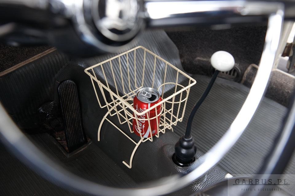 Druciany koszyk idealny do przechowywania, wyposażony w dwa uchwyty na kubki o różnych rozmiarach. Produkt należy zamontować na tunelu, w miejscu nieutrudniającym kierowcy prowadzenie samochodu.
