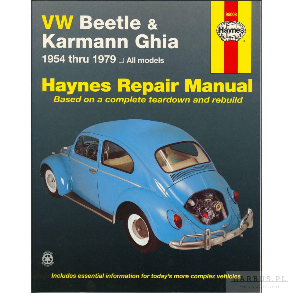 Instrukcja obsługi do samochodów VW Garbus T1 i VW Karmann Ghia T14 w języku angielskim wydawnictwa Haynes Publishing Group. Książka zawiera dane diagnostyczne i regulacyjne modeli produkowanych w latach 1954 do 1979 z silnikami benzynowymi o pojemnościach: