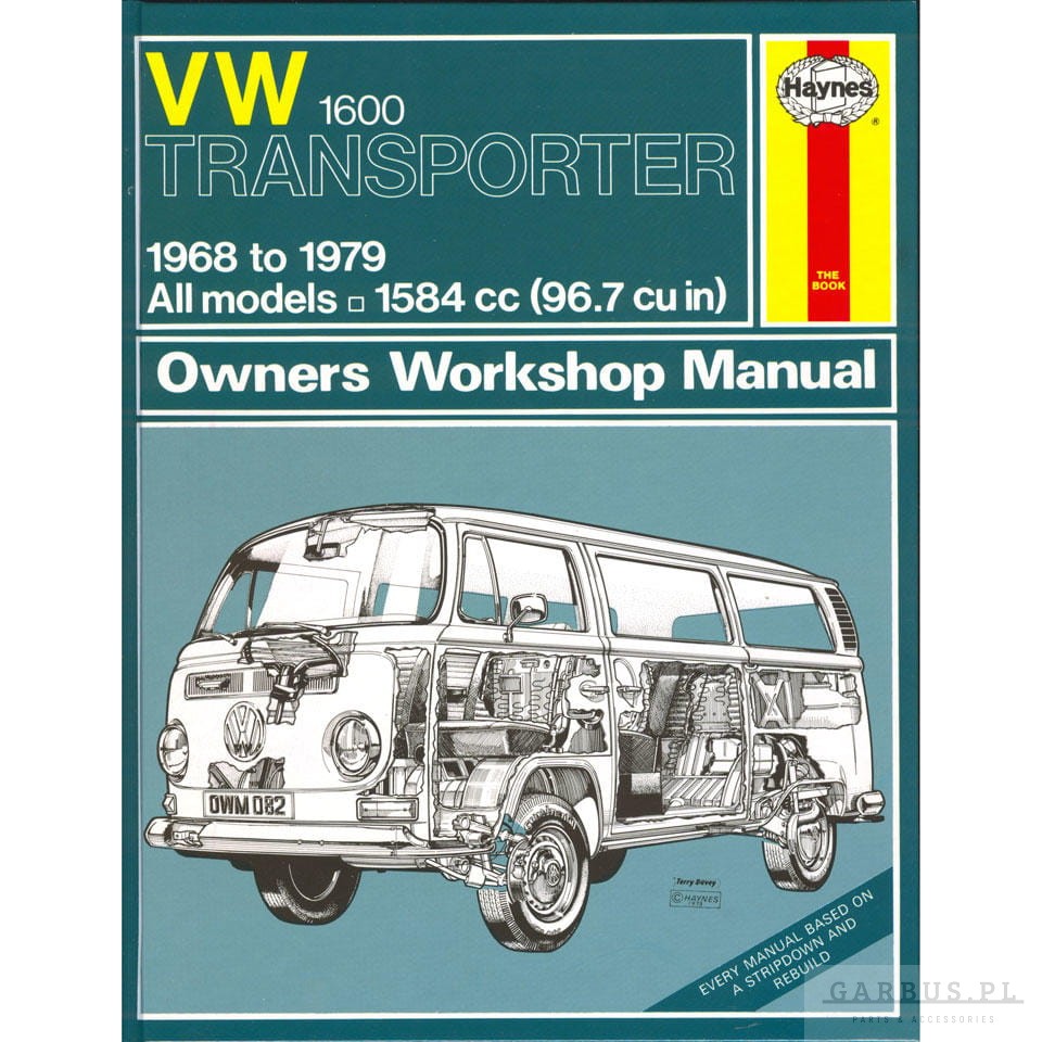 Instrukcja obsługi do samochodów VW Transporter T2 1600 w języku angielskim wydawnictwa Haynes Publishing Group. Książka zawiera dane diagnostyczne i regulacyjne modeli z silnikami benzynowymi o pojemności 1,6l, produkowanych w latach 1968 do 1979.